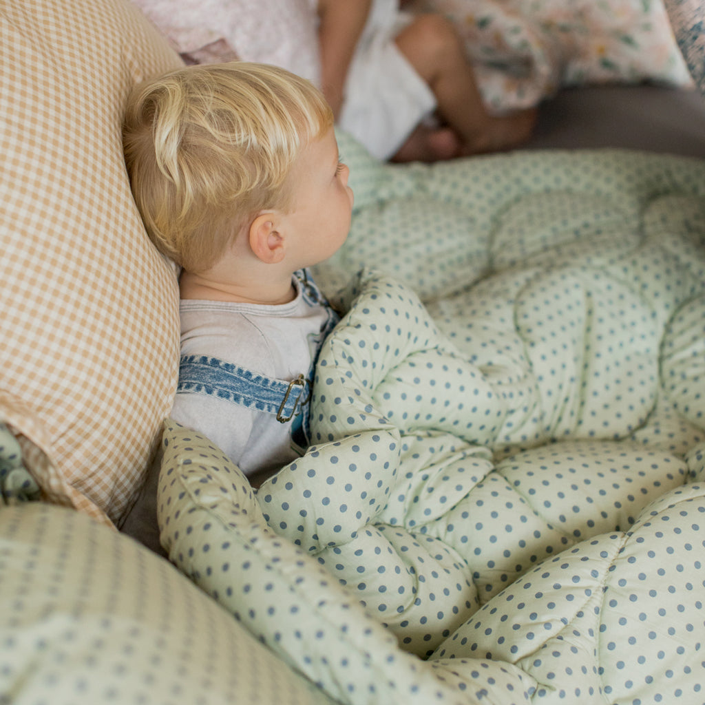 What can't our new Up! Toppers be? We designed them with Nan's eiderdown in mind. That sweet vintage bed topper and comforter that sits all so pretty at the end of the bed, but also on your lap watching tele, on the floor for a play or a little snooze mat!